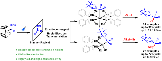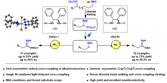 烷基锆由于可以通过天然丰富的烯烃在温和条件下通过氢锆化制备,并且具备优异官能团耐受性、独特的光活性和远程金属迁移等优点,已成为非常实用的有机合成试剂被广泛应用到药物分子,功能材料等合成中。然而烷基锆在不对称催化和手性合成中的应用非常有挑战性,目前为止仅有两例被开发出来,分别是不对称共轭加成(ACA)(Nat. Chem., 2012, 649)和不对称烯丙基烷基化(AAA)(Nature, 2015, 351)反应。在此之外,烷基锆试剂在更为实用和广谱的不对称交叉偶联反应中的应用尚未攻克。为解决此科学难题,齐湘兵实验室在原创的可见光促进镍催化烷基锆交叉偶联化学基础上(Chem, 2020, 675),融合了烷基锆可控“链行走”的优势(J. Am. Chem. Soc., 2020, 11506),通过设计不同的手性配体高对映选择性地构建了广谱的C(sp3)–C(sp3)和C(sp3)–C(sp2)碳碳键,高效制备了在合成化学领域具有实际应用价值的手性有机硼试剂。本研究是首个使用烷基锆试剂与非活化卤代烃进行不对称交叉偶联反应,同时在反应机理上也是在不对称偶联领域中最具挑战的自由基立体选择性偶联研究。