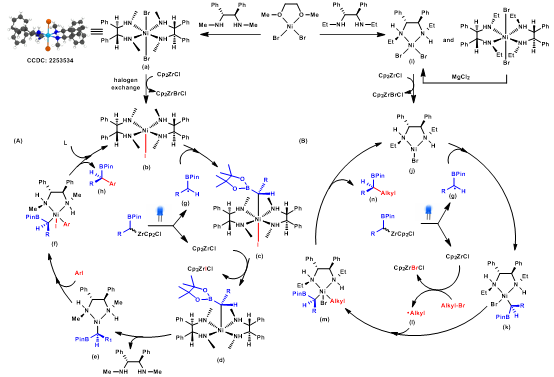 此外,在机理研究中,作者通过自由基捕获以及电子自旋共振(EPR)实验捕获并验证了烷基锆硼试剂在LED蓝光照射下产生了烷基硼自由基,并通过α-溴代环丙烷的开环自由基钟实验侧面验证了低价态锆络合物的存在。这两点实验证据佐证了烷基锆硼受到蓝光照射均裂的可能性。基于这一发现本文推测了自由基类型镍催化的交叉偶联机理。然而有别于传统的单配体单金属催化机制,在本文的工作中,作者发现在N,N-二甲基-1,2-二苯基乙二胺配体催化的C(sp3)–C(sp2)不对称偶联反应中,产物的ee值与配体的ee值呈现凹型的非线性关系。而在N,N-二乙基-1,2-二苯基乙二胺催化的C(sp3)–C(sp3) 不对称偶联反应中则呈现线性关系,由此作者推测在C(sp3)–C(sp2)不对称偶联反应中,手性决定步骤中为双配体单金属的ML2催化模式,而在C(sp3)–C(sp3)不对称偶联反应中则为单配体单金属ML模式。除此之外,在反应动力学实验中作者发现,在C(sp3)–C(sp2)不对称偶联中,烷基锆硼反应级数为1级,芳基卤代烃的反应级数为0级,而在C(sp3)–C(sp3)不对称偶联中,烷基锆硼与烷基卤代烃的反应级数均为一级,作者推断反应可能经历了烷基锆硼在光照下还原烷基卤代烃产生烷基自由基的过程,而非传统的双电子氧化加成过程,这一推测也在环丙烷开环的自由基钟的对照实验中也得到了验证。
