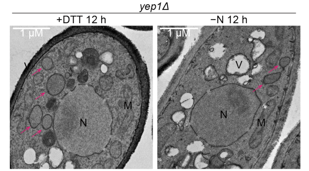 图1:电镜分析显示yep1敲除突变体中内质网自噬与核自噬货物在胞质中积累