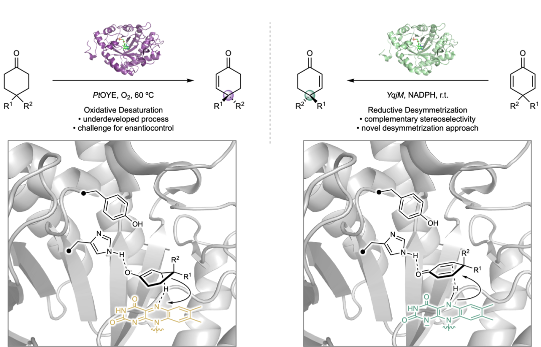 2024年7月1日,北京生命科学研究所 / 清华大学生物医学交叉研究院刘臻实验室与西班牙赫罗纳大学Marc Garcia-Borràs团队合作,在《Nature Synthesis》杂志发表了题为 “Biocatalytic desymmetrization for synthesis of chiral enones using flavoenzymes” 的研究论文。本研究分别利用黄素依赖酶的氧化和还原过程实现了立体手性互补的烯酮化合物的合成。具体而言,本研究一方面发展了一种基于黄素依赖酶的不对称脱氢反应体系,通过酶催化的去饱和化过程,高对映选择性地合成含季碳手性中心的环己烯酮类化合物。通过分子动力学模拟以及DFT计算的手段,结合机理实验,作者深入地研究了这一酶催化的反应历程。基于对反应机理的探究,作者随后发现如果利用还原态的黄素酶对环己二烯酮进行不对称还原,则可以获得相反构型的环己烯酮对映体产物。这两种酶催化方法反应条件温和,操作简单,底物适用范围广泛,不管是催化脱氢还是不对称还原反应均可达到优异的底物转化率和高对映选择性。因此,这些方法有望在药物、天然产物等精细化学品的不对称合成中得到应用。