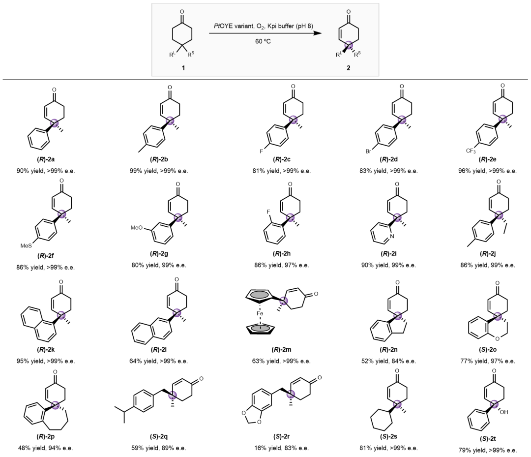 总的来说,利用互补的脱氢与还原转化为获得两种对映异构体的手性烯酮化合物提供了高效且立体选择性的合成方法,凸显了基于黄素依赖酶的去对称化策略在合成化学中的应用价值。这项工作为合成含有手性季碳中心的环己烯酮提供了高效、绿色且立体可控的新策略,在有机合成和药物开发等领域具有重要的应用前景。
