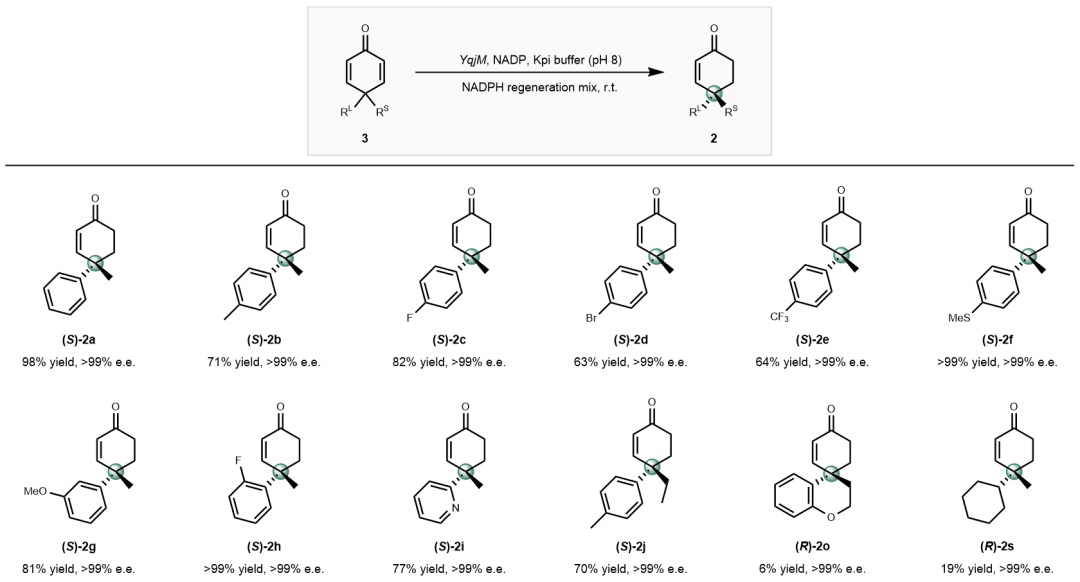 尽管研究人员已成功开发出一种高效的生物催化脱氢系统来获得高立体选择性的烯酮产物,但考虑到两种对映异构体在合成化学中的同等重要性,研究团队希望能够通过酶催化方法进一步获得相反构型的产物。受酶促脱氢机理的启发,研究人员设想如果将环己酮底物替换成环己二烯酮化合物,两者与蛋白酶结合的模式应当相似。由于烯烃还原反应将发生于之前环己酮底物脱氢的同一侧,因此目标产物中环己烯酮的双键位置将与脱氢过程得到的双键位置相反。令人高兴的是,作者的设想在后续的实验中得到了成功的验证。经过对酶催化剂的筛选和反应条件的优化,作者发现YqjM酶可以高效地催化环己二烯酮化合物3a的不对称还原过程 (获得98%的产率和 >99%的e.e.)。随后的底物普适性研究进一步表明,这一酶促还原反应同样具有广泛的底物兼容性。