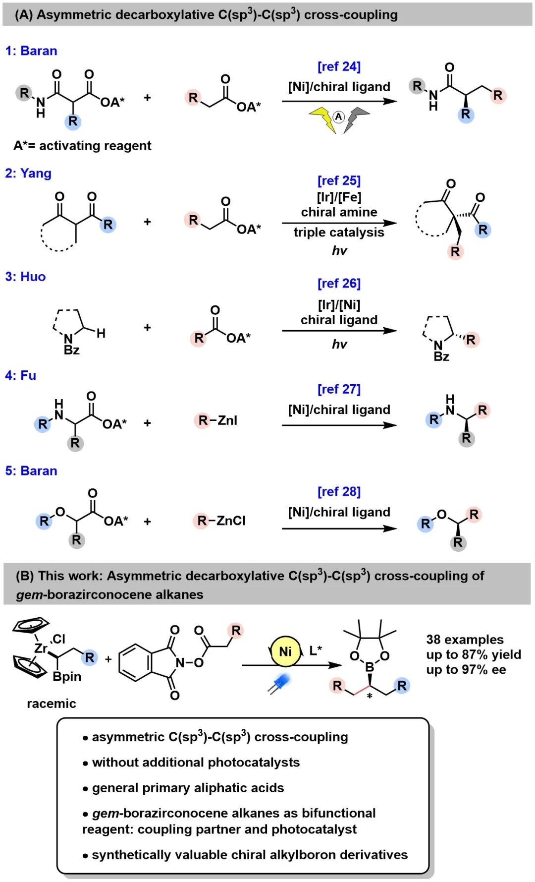 2024年9月17日,北京生命科学研究所/清华大学生物医学交叉研究院齐湘兵课题组在美国化学会旗下化学旗舰期刊《Journal of the American Chemical Society》杂志在线发表了题为“Enantioselective Decarboxylative C(sp3)-C(sp3) Cross-Coupling of Aliphatic Redox-Active Esters with gem-Borazirconocene Alkanes”的研究工作。天然丰富廉价易得的脂肪族羧酸及其衍生物因其稳定性,低毒性成为构建复杂分子框架最丰富和多样化的化学元件之一。过去几十年来大量过渡金属催化的脱羧交叉偶联反应被开发用于构建新的碳碳键和碳杂原子键。脱羧交叉偶联反应的高化学选择性和官能团耐受性使得生物活性分子和天然产物的后期多样化修饰成为可能,为探索药物化学空间提供了广泛的途径。尽管脂肪酸不对称脱羧交叉偶联反应已经取得了一些进展,但脂肪酸底物仍局限在α-杂原子或 α-羰基稳定的羧酸前体,与具有稳定自由基能力的α-杂原子和 α-羰基羧酸相比,通过未活化的一级脂肪羧酸脱羧产生不稳定的一级烷基自由基而实现的C(sp3)-C(sp3)交叉偶联反应仍未得到充分发展(Figure 1)。因此,开发新的未活化的一级脂肪族羧酸及其衍生物不对称脱羧偶联反应具有重要的应用潜力。此外,烷基金属参与的不对称脱羧偶联是实现一级脂肪酸转化的高效策略之一,然而目前已知的参与不对称脂肪酸脱羧偶联的烷基金属试剂主要局限在烷基锌试剂,相比烷基锌试剂,烷基锆试剂可以通过天然来源丰富的烯烃在温和条件下由氢锆化反应制备,这种多功能有机金属物种表现出卓越的官能团耐受性、独特的光化学反应活性,以及通过其“链行走”能力促进远程 C−H键官能化的能力,成为了构建手性C(sp3)-C(sp3) 化学键的强大工具(Chem, 2020, 675; JACS, 2020, 11506; Chem, 2023, 2222)。对烷基锆试剂光反应活性的持续探索为开发不对称光氧化还原方法开辟了新途径。本研究结合脂肪族羧酸和烷基锆试剂的优势,开发了一种可见光促进的、镍催化的对映收敛 C(sp3)-C(sp3) 交叉偶联反应,实现了廉价易得简单一级脂肪族羧酸 NHPI 酯与烷基锆硼试剂的不对称交叉偶联,高效立体选择性的合成了具有高应用价值的手性烷基硼化合物,可以在保留手性中心的情况下立体专一性地衍生出大量手性分子。