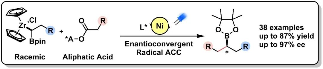 以羧酸为底物的脱羧偶联反应是构建手性合成子的有力工具,但是利用自然界丰富的一级烷基脂肪酸的不对称脱羧C(sp3)-C(sp3)偶联反应构建手性分子仍然充满挑战。本研究开发了可见光促进的镍催化烷基锆硼试剂与一级烷基脂肪酸NHPI酯的不对称自由基偶联方法,高效立体选择性地合成了具有高应用价值的手性烷基硼化合物,可以在保留手性中心的情况下立体专一性地衍生出大量手性分子。该不对称偶联反应条件温和,官能团耐受度高,可用于复杂药物分子和天然产物的后期官能团化修饰。该反应利用烷基锆硼试剂自身的光学活性,在无额外光敏剂的条件下实现羧酸NHPI酯的脱羧反应产生不稳定的一级烷基自由基,烷基锆硼试剂同时作为偶联试剂,在镍催化下实现了立体专一的自由基C(sp3)-C(sp3)交叉偶联。