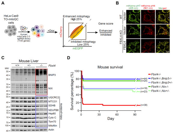 FBXL4缺失过度激活BNIP3和NIX依赖的线粒体自噬,造成线粒体数量减少和小鼠死亡。