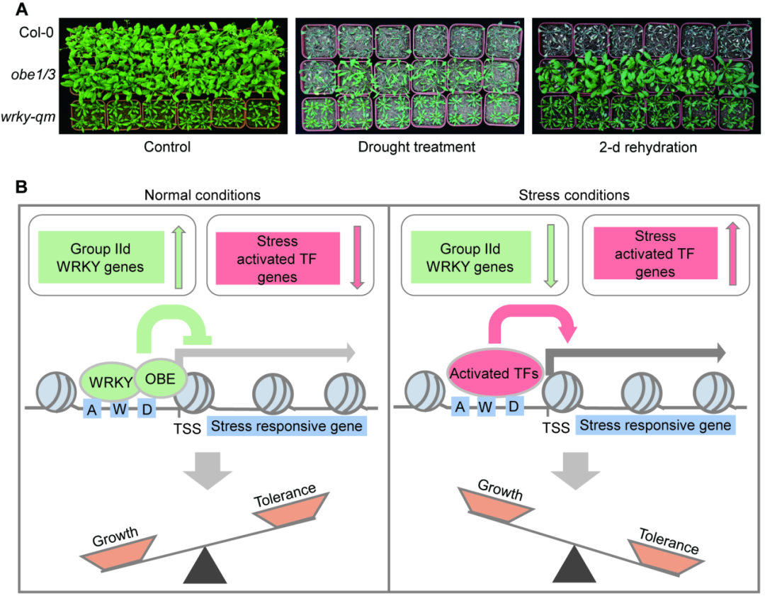 通过综合运用基因编辑和遗传杂交方法获得了多个不同组合的wrky和obe突变体,发现其中wrky7/11/17/21/39纯合wrky15杂合(wrky-qm/15+/-)的突变体与obe1/2和obe3/4突变体具有相似的生长缺陷表型,主要表现为植物根系发育以及真叶维管组织建立异常,揭示了WRKY-OBE复合体是植物正常生长发育所必需。通过RNA-seq和ChIP-seq联合分析发现,WRKY和OBE蛋白共同抑制大量逆境应答基因的表达。在wrky-qm和obe1/3突变体中,一系列经典的逆境应答基因(包括DREB1A、DREB1B、DREB1C、DREB2A、Rd29A和Rd29B等)的表达显著增加。干旱处理发现,wrky-qm和obe1/3突变体对干旱胁迫的耐受性显著增强(图2)。同时发现,在长时干旱处理条件下,多个WRKY和OBE基因的表达显著降低,揭示了植物在干旱条件下维持逆境应答基因持续表达的新机制(图2)。