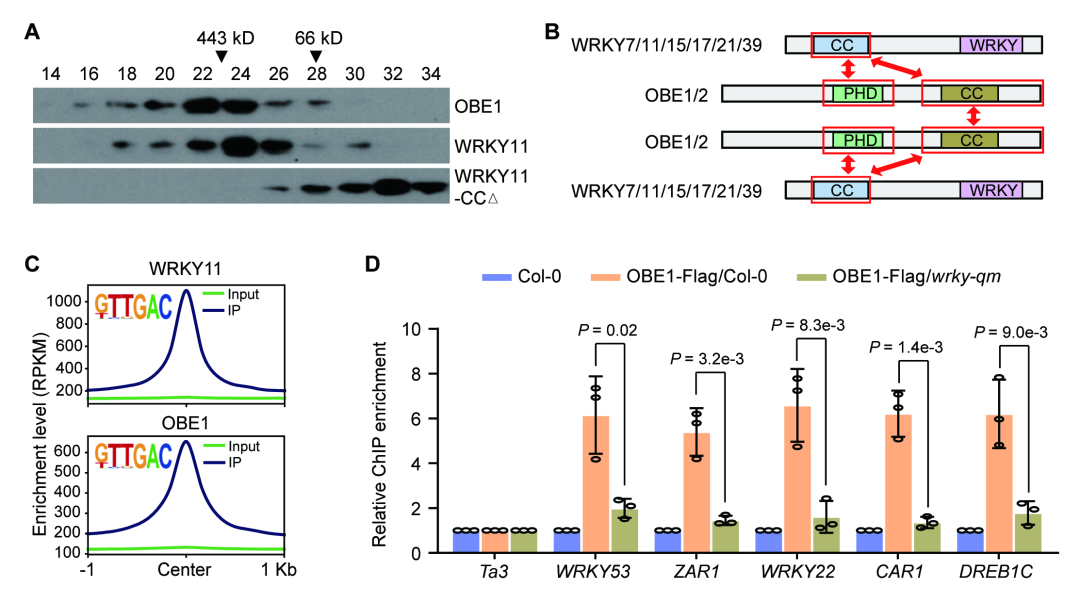 该研究通过蛋白免疫亲和纯化结合质谱分析, 发现拟南芥中的IId类WRKY转录因子能够与OBE家族蛋白互作形成一类新的植物特异的蛋白复合体,该研究将这类复合体命名为WRKY-OBE复合体。进一步研究发现,IId类WRKY转录因子的N-端区域包含一段高等植物中保守的coiled-coil(CC)结构域,该结构域负责与OBE蛋白的结合。两个OBE蛋白之间能够互作形成二聚体,并分别结合一个WRKY蛋白,从而形成一个包含两个OBE蛋白和两个WRKY蛋白的四亚基WRKY-OBE复合体(图1)。另外,OBE家族蛋白OBE1的PHD结构域能够特异性识别组蛋白H3K4me2/3修饰,同时OBE1能够通过与OBE2互作增强其对组蛋白的结合能力,揭示了组蛋白参与WRKY-OBE复合体转录调控功能的可能分子机制。