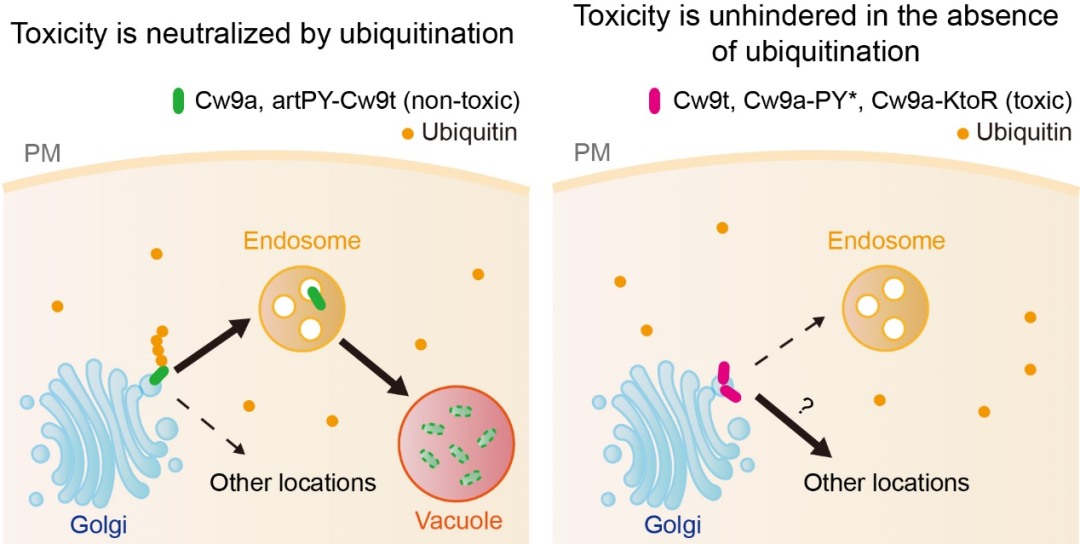 泛素化修饰是如何抑制毒性的呢?作者发现,泛素化修饰是决定解药蛋白亚细胞定位的分选信号。被泛素化修饰的解药蛋白从反式高尔基网络(trans-Golgi network,TGN)被运送到内体(endosome),并进而到达液泡。在液泡或内体定位的解药蛋白不产生毒性。相反地,当PY基序被突变之后,解药蛋白不发生泛素化,就不再被从反式高尔基网络转运到内体,而是变成与毒药蛋白具有相同的亚细胞定位,导致解药蛋白的内在毒性显现出来(图1)。