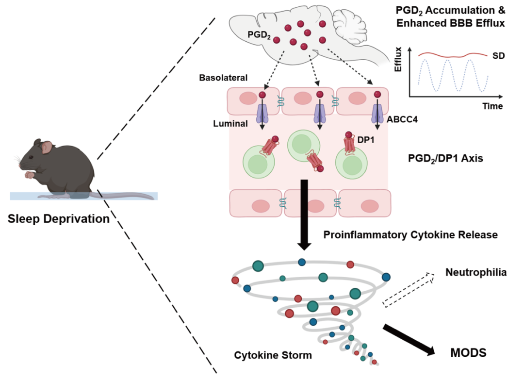 除此之外,为了研究睡眠剥夺如何调控免疫反应,研究人员首先探究睡眠剥夺如何影响大脑神经系统的功能。研究人员发现睡眠剥夺导致的免疫反应并非通过大脑向外周的直接神经投射进行调控,而是通过大脑产生的特定分子释放到外周循环系统进而诱发的。睡眠剥夺后,小鼠的血脑屏障的主动外排(active efflux)活动持续显著增强。血脑屏障的主动外排活动由ABC转运受体介导,而这其中,通过药物和抑制ABCC家族转运受体能够缓和睡眠剥夺小鼠体内的免疫反应并且延长睡眠剥夺小鼠的存活时间。因而,研究人员推断睡眠剥夺导致的免疫反应由ABCC转运受体的某种底物介导;在睡眠剥夺过程中,随着血脑屏障主动外排活动从大脑转运到外周,进而引起免疫反应。