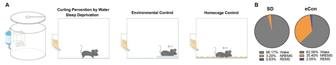 在此研究课题中,张二荃实验室研究人员首创了一套适用于小鼠的定名为“Curling Prevention by Water”(CPW)的睡眠剥夺系统(图1),通过脑电图/肌电图(EEG/EMG)记录实验组小鼠和对照组小鼠的睡眠/觉醒情况,确认该系统可以持续剥夺小鼠95%以上的睡眠。该系统相较于传统的实验动物转杆睡眠剥夺系统(Stand Alone Sleep Deprivation,SASD),可以在不引入更多环境刺激和保证实验通量的基础上极大提高睡眠剥夺效率,从而帮助研究人员可以观察到长时间睡眠剥夺后对哺乳动物带来的生理后果。